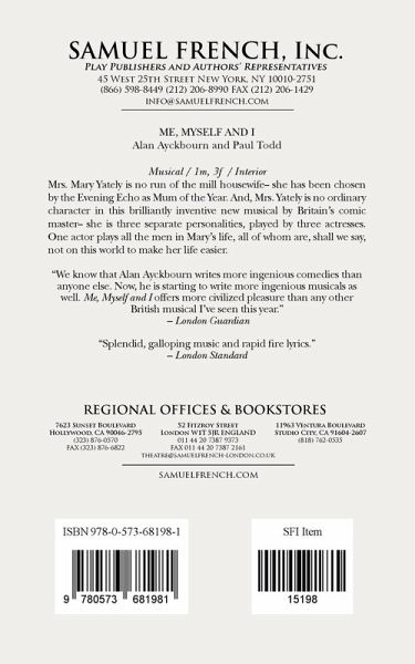 Musical Characters: 1 male, 3 female Interior Set Book and Lyrics by Alan Ayckbourn. Music by Paul Todd. Mrs. Mary Yately is no run of the mill housewife-- she has been chosen by the Evening Echo as Mum of the Year. And, Mrs. Yately is no ordinary character in this brilliantly inventive new musical by Britain's comic master-- she is three separate personalities, played by three actresses. One actor plays all the men in Mary's life, all of whom are, shall we say, not on this world to make her life easier. "We know that Alan Ayckbourn writes more ingenious comedies than anyone else. Now, he is starting to write more ingenious musicals as well. Me, Myself and I offers more civilized pleasure than any other British musical I've seen this year."-- London Guardian. "Splendid, galloping music and rapid fire lyrics."-- London Standard.