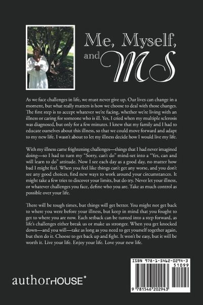 Me, Myself and MS is a true-to-life, heartwarming, and inspirational memoir that deals with what I went through and go through on a day-to-day, more specifically, a minute-to-minute basis in the battle of living with multiple sclerosis. This book will give a detailed description of my life from the moment of diagnoses to the many symptoms, medications, treatments, and some of the possible side effects. It is also a portrayal of the tears, laughter, triumphs, and tribulations that are a part of living with multiple sclerosis. Me, Myself and MS is not only targeted for people living with multiple sclerosis, but it is also for anyone dealing with life's challenges and who are in need of a little inspiration. It makes a statement that the choice is yours. You can submit to your illness and hardships, or you can see these challenges as a new chapter in your life and move forward fighting tooth and nail with each new blow that is thrown you way. With two hundred people diagnosed weekly with multiple sclerosis, this inspirational book will help ease some of the fears about what you might go through. It is meant to encourage and guide those that are going through this journey or any challenges in their lives. In my family, there are four of us living with multiple sclerosis, and I was the first to be diagnosed. There was no one that I could turn to for advice as to what to expect. I hadn't even heard the words multiple sclerosis or what this illness was, so I wanted to pass along that although you have been given a new life/way of living, you can/will survive your diagnoses. This is a journey-one that I have been on for twenty-three years and counting.