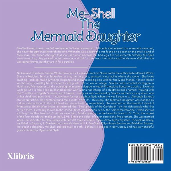 Nicknamed Christeen, Sandra White-Browne is a Licensed Practical Nurse and is the author behind Sandi White. She is a Resident Service Supervisor at the, memory care, assisted living facility where she works. She loves teaching, learning, reading, writing, laughing and enjoys spending time with her family and friends. Her son Marlon was home schooled by her from first to fifth grade. He is now in college. Sandra holds a bachelor's degree in Healthcare Management and is pursuing her master's degree in Health Professions Education, both, at Excelsior College. She is also a self-published author, with Xlibris Publishing, of a children's book named "Playing with Rain" written in English, Spanish, and Chinese. The book was translated by Sandra and tells a story about one of her childhood pass time. It was written for her daughter Nyda when she was 8 years old. Although Sandra's stories are fiction, they center around real events in her life. This story, The Mermaid Daughter, was inspired by a dream she woke up in the middle of and started writing immediately. She was born on the beautiful island of Montserrat, British West Indies, A.K.A. the "Emerald Isle of the Caribbean". Her family moved to the United States Virgin Islands, A.K.A. the "American Paradise", when she was a little girl and has been a U.S. citizen since then. Sandra grew up on the beautiful island of St. Croix, the largest of the four islands that make up the U.S.V.I. She is the oldest of seven sisters and five brothers. She was married when she relocated to New Jersey with her first three children, Myron Allen, Nyda Krysteen Thompkins-Bailey, and Marlon Browne, II. She had two more children in N.J., Me-Shell J'Nya-Raven Browne and Malakhai Browne. Her second daughter, Me-Shell, passed away at birth. Sandra still resides in New Jersey and has six wonderful grandchildren by Myron and Nyda.