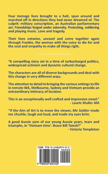 The Vietnam War and the act of conscription irrevocably change the lives of four teenage Australians. John Mitchell, a bespectacled bass guitarist from Melbourne with a fatalistic notion of becoming an Anzac like his emotionally fragile father and grandfather before him becomes mates with two very different characters he meets in the army who he would never have otherwise crossed paths with. Trevor "Chubby" Jackson, the apparent heir to an outback West Australian cattle station and Hedley Yangaboora, an Indigenous stockman from the same property. All three are caught up in one particularly debilitating 'friendly fire' incident in Vietnam from which only the least likely character, Hedley, manages to get his post-war life back in order. The fourth character, Frankie Jamieson, is an unrelentingly positive individual who others tend to lean on. She struggles to maintain her studies at Melbourne University while singing in a pop duo with her childhood friend Cindy Fong, granddaughter of a Chinese pear orchardist. Frankie is drawn into the protest movement. The story explores the teenage years of all the characters leading up to the boy's names being drawn from the infamous televised spinning barrel. John and Frankie's independent journeys through the band scene of 60's Melbourne, Hedley's battles with ingrained racism and dislocation and Chub's grappling with the complexities of trying to learn how to run an outback cattle station in the 1967 referendum era when unpaid Indigenous labour came to an end. Frankie's story unfolds in stark parallel contrast with the other characters as they negotiate Infantry training in their very different ways. Through Frankie, the reader experiences the street marches and eventual Police raid on Melbourne Uni's Union Building. She quits the pop duo but not her friend Cindy and becomes a protest singer around the pubs and clubs of 1970's Melbourne. Her love affair with Jack, a draft resister being supported by his union, leads to marriage and eventual tragedy. The incident in Vietnam infuses a dark uncertainty that hangs in the background of the story until the end. Hedley loses his right arm in friendly fire and both John and the reader believe John fired the shot. John keeps this to himself. After the boys are unceremoniously discharged they try to come to terms with what they have been through and grapple with 'normality' again. In later life Frankie meets John and they discover their past band connections. This is no 'senior romance,' more social worker and desperate gutter dweller. Frankie facilitates a reunion of the veterans on Hedley's cattle station. If there is a single hero in this story it is Hedley but he takes his time coming to the forefront. Once there he is unstoppable, an inspirational voice leading through extreme adversity. It is his casual revelation to John at the reunion that puts to rest the lingering mystery from the Vietnam incident and makes a mockery of lost lives.