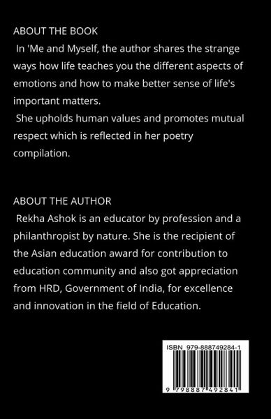 In 'Me and Myself, the author shares the strange ways how life teaches one the different aspects of emotions and how to make better sense of life' important matters. She upholds human values and promotes mutual respect which is reflected in her poetry compilation.