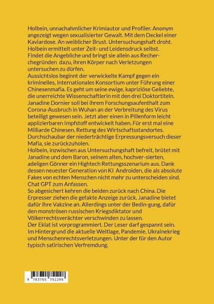 Holbein, unnachahmlicher Krimiautor und Profiler. Anonym angezeigt wegen sexualisierter Gewalt. Mit dem Deckel einer Kaviardose. An weiblicher Brust. Untersuchungshaft droht.Holbein ermittelt unter Zeit- und Leidensdruck selbst. Findet die Angebliche und bringt sie allein aus Recherchegründen dazu, ihren Körper nach Verletzungen untersuchen zu dürfen. Aussichtslos beginnt der verwickelte Kampf gegen ein kriminelles, internationales Konsortium unter Führung einer Chinesenmafia. Es geht um seine ewige, kapriziöse Geliebte, die unerreichte Wissenschaftlerin mit den drei Doktortiteln. Janadine Dornier soll bei ihrem Forschungsaufenthalt zum Corona-Ausbruch in Wuhan an der Verbreitung des Virus beteiligt gewesen sein. Jetzt aber einen in Pillenform leicht applizierbaren Impfstoff entwickelt haben. Für erst mal eine Milliarde Chinesen. Rettung des Wirtschaftsstandortes.Durchschaubar der niederträchtige Erpressungsversuch dieser Mafia, sie zurückzuholen.Holbein, inzwischen aus Untersuchungshaft befreit, brütet mit Janadine und dem Baron, seinem alten, hochver-sierten, adeligen Gönner ein Hightech Rettungsszenarium aus. Dank dessen neuester Generation von KI Androiden, die als absolute Fakes von echten Menschen nicht mehr zu unterscheiden sind. Chat GPT zum Anfassen.So abgesichert kehren die beiden zurück nach China. Die Erpresser ziehen die gefakte Anzeige zurück. Janadine bietet dafür ihre Vakzine an. Allerdings unter der Bedingung, dafür den monströsen russischen Kriegsdiktator und Völkerrechtsverächter verschwinden zu lassen.Der Eklat ist vorprogrammiert. Der Leser darf gespannt sein.Im Hintergrund die aktuelle Weltlage, Pandemie, Ukrainekrieg und Menschenrechtsverletzungen. Unter der für den Autor typisch satirischen Verfremdung.