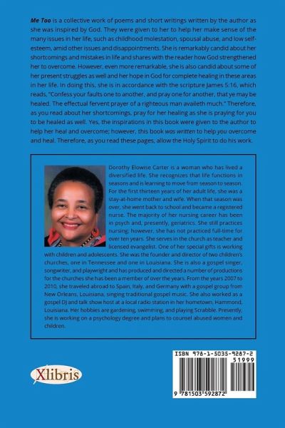 Mrs. Dorothy Elowise Carter-Tate is a woman who has lived a diversified life. She recognizes that life functions in seasons and is learning to move from season to season. For the first thirteen years of her adult life, she was a stay-at-home mother and wife. When that season was over, she went back to school and became a registered nurse. The majority of her nursing career has been in psych and, presently, geriatrics. She still practices nursing; however, she has not practiced full-time for over ten years. She serves in the church as teacher and licensed evangelist. One of her special gifts is working with children and adolescents. She was the founder and director of two children's churches, one in Tennessee and one in Louisiana. She is also a gospel singer, songwriter, and playwright and has produced and directed a number of productions for the churches she has been a member of over the years. From the years 2007 to 2010, she traveled abroad to Spain, Italy, and Germany with a gospel group from New Orleans, Louisiana, singing traditional gospel music. She also worked as a gospel DJ and talk show host at a local radio station in her hometown, Hammond, Louisiana. Her hobbies are gardening, swimming, and playing Scrabble. Presently, she is working on a psychology degree and plans to counsel abused women and children.