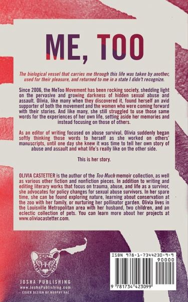 Olivia Castetter is the author of the Too Much memoir collection, as well as various other fiction and nonfiction pieces. In addition to writing and editing literary works that focus on trauma, abuse, and life as a survivor, she advocates for policy changes for sexual abuse survivors. In her spare time, she can be found exploring nature, learning about conservation at the zoo with her family, or nurturing her pollinator garden. Olivia lives in the Louisville Metropolitan area with her husband, two children, and an eclectic collection of pets. You can follow her journey and learn more about her various social projects on her website, www.oliviacastetter.com.