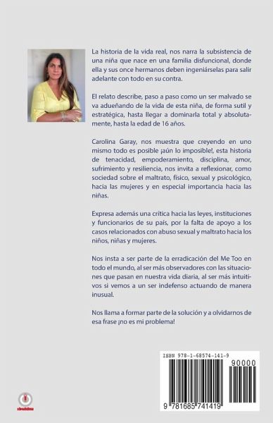 La historia de la vida real, nos narra la subsistencia de una niña que nace en una familia disfuncional, donde ella y sus once hermanos deben ingeniárselas para salir adelante con todo en su contra. El relato describe, paso a paso como un ser malvado se va adueñando de la vida de esta niña, de forma sutil y estratégica, hasta llegar a dominarla total y absolutamente, hasta la edad de 16 años. Carolina Garay, nos muestra que creyendo en uno mismo todo es posible ¡aún lo imposible!, esta historia de tenacidad, empoderamiento, disciplina, amor, sufrimiento y resiliencia, nos invita a re exionar, como sociedad sobre el maltrato, físico, sexual y psicológico, hacia las mujeres y en especial importancia hacia las niñas. Expresa además una crítica hacia las leyes, instituciones y funcionarios de su país, por la falta de apoyo a los casos relacionados con abuso sexual y maltrato hacia los niños, niñas y mujeres. Nos insta a ser parte de la erradicación del Me Too en todo el mundo, al ser más observadores con las situaciones que pasan en nuestra vida diaria, al ser más intuitivos si vemos a un ser indefenso actuando de manera inusual. Nos llama a formar parte de la solución y a olvidarnos de esa frase ¡no es mi problema!