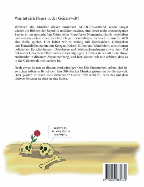 Was tut sich Neues in der Geisterwelt? Nachdem die Musiker der uns wohlbekannten AC/DC-Coverband schon längst wieder die Bühnen der Republik unsicher machen, sind deren nicht totzukriegende Seelen in der geisterhaften Ödnis eines fiktiven Frankfurter Niemandsumlands verblieben und müssen sich mit den gleichen Dingen beschäftigen, die auch in unser Welt eine Rolle spielen. Hier haben wir es ständig mit Drecksäcken, Geldsäcken und Trauerklößen zu tun, mit Kriegen, Krisen, Klima und Windrädern, umstrittenen politischen Entscheidungen, Osterhasen und Weihnachtsmännern sowie dem vielgesichtigen Tod und dem Grundgütigen. Oftmals stehen all diese Dinge zueinander in direktem Zusammenhang, und hier können wir nun erleben, dass es in der Geisterwelt nicht anders ist. Doch etwas ist neu an diesem merkwürdigen Ort: Die Gartenarbeit erfreut sich inzwischen äußerster Beliebtheit. Ein Offenbacher Musiker gärtnert in der Geisterwelt. Oder geistert er durch die Gärtnerwelt? Beides trifft wohl zu, aber das mit dem Grünen Daumen ist eben so eine Sache.