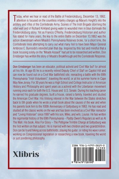 Today, when we hear or read of the Battle of Fredericksburg, December 13, 1862, attention is focused on the countless infantry charges up Marye¿s Height¿s into the artillery and rifles of the Confederate Army. Scenes of The Irish Brigade storming the rebel wall and of Richard Kirkland giving water to wounded men in blue dominate the Fredericksburg story. Yet as Francis O¿Reilly, Fredericksburg Historian and author has stated for many years, the key to the entire Battle on December 13,1862 was the action downstream where Meade¿s Pennsylvania Reserves broke, for a short time, the Confederate lines attempting to carry out what many feel to have been Major General Ambrose E. Burnside¿s intended plan that day. Inspired by this fact and mindful that a book focusing solely on the "Meade Assault" had yet to be researched and written, Don Ernsberger has written the story of Meade¿s Breakthrough and the Confederate Response.