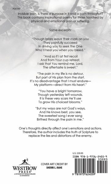Invisible pain. Is there a purpose in it and a path through it? This book contains inspirational poetry for those touched by physical and emotional pain or suffering. Some excerpts: Though briars leave their mark on you They painfully succeed In driving you to seek the One Wholl heal you when you bleed. And so if I at first recoil And from Your cup retreat, I ask that You remind me, Lord, The aftertaste is sweet. The pain in my life is no detour, But part of His plan from the start. Its no disadvantage that I must endure My platformdirect from His heart. You have a bright tomorrow, Though…mehr