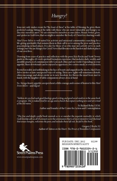 Hungry? Jesus not only makes room for "the least of these" at his table of blessing, he gives them preferred seating. Sitting at the table with those who are most vulnerable and hungry, we discover ourselves anew. We are returned to ourselves as ones taken, blessed, broken, given, and spoken in God's love, that we might re-member the body of Christ for a hurting world. Meal From Below is well-suited for activists and missional communities searching for a life-giving spirituality that sustains them in their call to serve among the poor and practice peacemaking in hard places. It is also for those of us who may not actively serve in such settings, but who are hungry for Good News that liberates in the hardest and darkest places of our own lives. Drawing from years of practice and reflection with the poor, Kris Rocke and Scott Dewey guide us through a 40-week spiritual formation experience that includes daily, weekly, and monthly practices of communion with God, each other, and our world. Depending on your appetite, these devotionals can be enjoyed as appetizers, five-course meals, or even desserts. Rooted in reality and unblinking in the face of beauty and anguish in the streets, Meal From Below invites us into unexpected ways of seeing. These new sights will sometimes disturb, often encourage, and always invite us to new freedom. Joy flavors the meal from start to finish, with the laughter of table companions always close at hand. So... bring a hearty appetite, an open heart, a little courage, and a sense of humor to this Meal from Below-and dig in!
