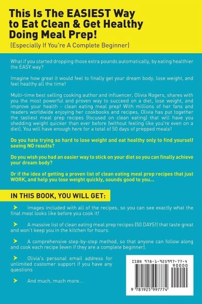 This Is The EASIEST Way to Eat Clean & Get Healthy Doing Meal Prep (Especially If You're A Complete Beginner)! What if you started dropping those extra pounds automatically, by eating healthier the EASY way? Imagine how great it would feel to finally get your dream body, lose weight, and feel healthy all the time! Multi-time best selling cooking author and influencer, Olivia Rogers, shares with you the most powerful and proven way to succeed on a diet, lose weight, and improve your health - clean eating meal prep! With millions of her fans and readers worldwide enjoying her cookbooks and recipes, Olivia has put together the tastiest meal prep recipes (focused on clean eating) that will have you shedding weight quicker than ever before (without feeling like you're even on a diet). You will have enough here for a total of 50 days of prepped meals! Do you hate trying so hard to lose weight and eat healthy only to find yourself seeing NO results? Do you wish you had an easier way to stick on your diet so you can finally achieve your dream body? Or if the idea of getting a proven list of clean eating meal prep recipes that just WORK, and help you lose weight quickly, sounds good to you... THEN THIS BOOK IS FOR YOU! In this book, you will get: Images included with all of the recipes, so you can see exactly what the final meal looks like before you cook it! A massive list of clean eating meal prep recipes (50 DAYS!) that taste great and won't keep you in the kitchen for hours. A comprehensive step-by-step method, so that anyone can follow along and cook each recipe (even if they are a complete beginner). Olivia's personal email address for unlimited customer support if you have any questions And much, much more... Well, what are you waiting for? Grab your copy today by clicking the BUY NOW button at the top of this page!