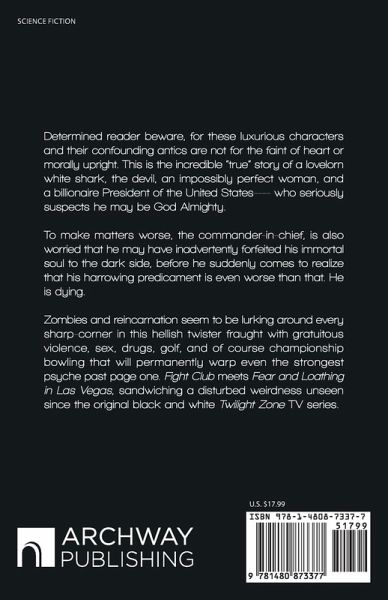 Determined reader beware, for these luxurious characters and their confounding antics are not for the faint of heart or morally upright. This is the incredible "true" story of a lovelorn white shark, the devil, an impossibly perfect woman, and a billionaire President of the United States---- who seriously suspects he may be God Almighty. To make matters worse, the commander-in-chief, is also worried that he may have inadvertently forfeited his immortal soul to the dark side, before he suddenly comes to realize that his harrowing predicament is even worse than that. He is dying. Zombies and reincarnation seem to be lurking around every sharp-corner in this hellish twister fraught with gratuitous violence, sex, drugs, golf, and of course championship bowling that will permanently warp even the strongest psyche past page one. Fight Club meets Fear and Loathing in Las Vegas, sandwiching a disturbed weirdness unseen since the original black and white Twilight Zone TV series.
