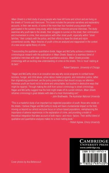 Mean Streets is a field study of young people who have left home and school and are living on the streets of Toronto and Vancouver. This book includes the personal narratives and explanatory accounts, in their own words, of some of the more than four hundred young people who participated in the summer-long study, which featured intensive personal interviews. The study examines why youth take to the streets, their struggles to survive on the street, their victimization and involvement in crime, their associations with other street youth, especially within 'street families', their contacts with the police, and their efforts to leave the street and rejoin conventional society. Major theories of youth crime are analyzed and reappraised in the context of a new social capital theory of crime.