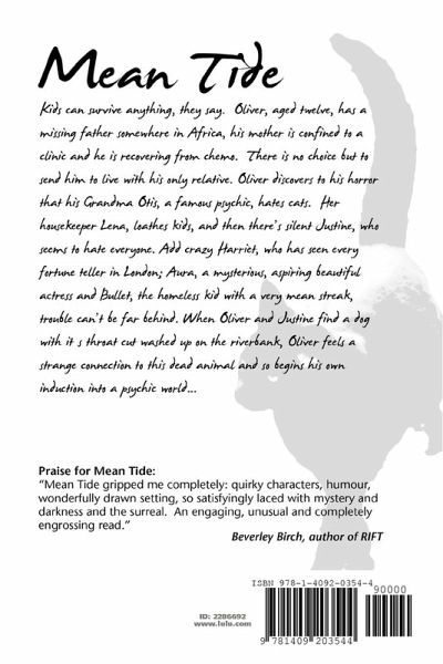 Kids can survive anything, they say. Oliver, aged twelve, has a missing father in Africa, his mother has had a breakdown, and he is recovering from chemo. He is sent to live with his only relative. On a foggy day, one bald boy, with his cat, Flop, arrives at his Grandma's house at the water's edge in Greenwich. Oliver discovers to his horror that his Grandma, a famous psychic, hates cats. Her housekeeper, Lena loathes kids, and silent Justine seems to hate everyone. Add crazy Harriet, who has seen every fortune teller in London; Aura, a mysterious, aspiring beautiful actress and Bullet, the homeless kid with a very mean streak, trouble can't be far behind. When Oliver and Justine find a beautiful dog with it's throat cut washed up on the riverbank, Oliver feels a strange connection to this dead animal and so begins his own induction into a psychic world. ************** 'An engaging, unusual and completely engrossing read' - Beverly Birch - author of 'Rift'