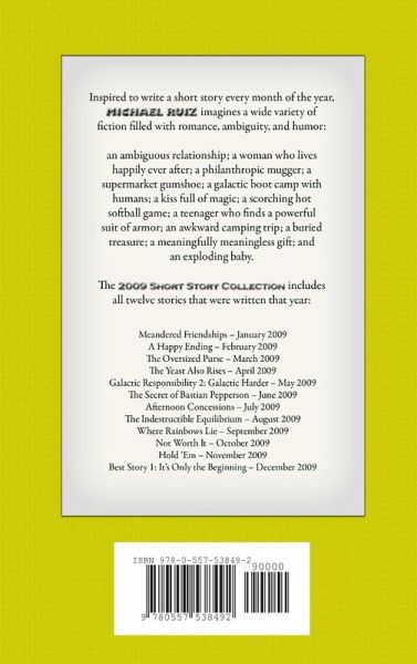 Inspired to write a short story every month of the year, Michael Ruiz imagines a wide variety of fiction filled with romance, ambiguity, and humor: an ambiguous relationship; a woman who lives happily ever after; a philanthropic mugger; a supermarket gumshoe; a galactic boot camp with humans; a kiss full of magic; a scorching hot softball game; a teenager who finds a powerful suit of armor; an awkward camping trip; a buried treasure; a meaningfully meaningless gift; and an exploding baby. The 2009 Short Story Collection includes all twelve stories that were written that year.