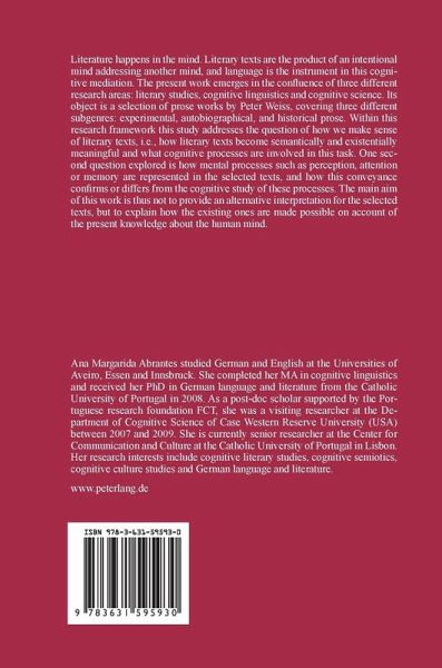 Literature happens in the mind. Literary texts are the product of an intentional mind addressing another mind, and language is the instrument in this cognitive mediation. This work emerges in the confluence of three different research areas: literary studies, cognitive linguistics and cognitive science. Its object is a selection of prose works by Peter Weiss, covering three different subgenres: experimental, autobiographical, and historical prose. Within this research framework this study addresses the question of how we make sense of literary text, i.e., how literary texts become semantically and existentially meaningful and what cognitive processes are involved in this task. One second question explored is how mental processes such as perception, attention or memory are represented in the selected texts, and how this conveyance confirms or differs from the cognitive study of these processes. The main aim of this work is thus not to provide an alternative interpretation for the selected texts, but to explain how the existing ones are made possible on account of the present knowledge about the human mind.
