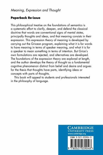 This philosophical treatise on the foundations of semantics is a systematic effort to clarify, deepen, and defend the classical doctrine that words are conventional signs of mental states, principally thoughts and ideas, and that meaning consists in their expression. This expression theory of meaning is developed by carrying out the Gricean program, explaining what it is for words to have meaning in terms of speaker meaning, and what it is for a speaker to mean something in terms of intention. But Grice's own formulations are rejected and alternatives developed. The foundations of the expression theory are explored at length, and the author develops the theory of thought as a fundamental cognitive phenomenon distinct from belief and desire, argues for the thesis that thoughts have parts, and identifies ideas or concepts with parts of thoughts. This book will appeal to students and professionals interested in the philosophy of language.