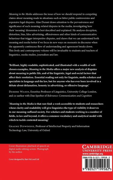 'Brilliant, highly readable, sophisticated, and illustrated with a wealth of well-chosen examples, Meaning in the Media offers a major new analysis of disputes about meaning in public life, and of the linguistic, legal and social factors that affect their resolution. Essential reading not only for linguists, media scholars and specialists in language and the law, but for anyone who has ever been involved in a debate about defamation, honesty in advertising, or offensive language.' Deirdre Wilson, Emeritus Professor of Linguistics, University College London and co-author with Dan Sperber of Relevance: Communication and Cognition