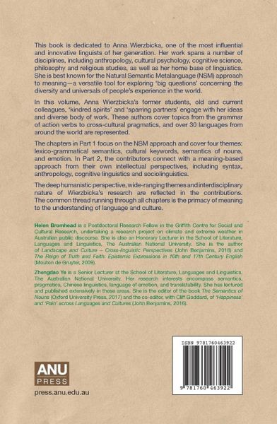 This book is dedicated to Anna Wierzbicka, one of the most influential and innovative linguists of her generation. Her work spans a number of disciplines, including anthropology, cultural psychology, cognitive science, philosophy and religious studies, as well as her home base of linguistics.