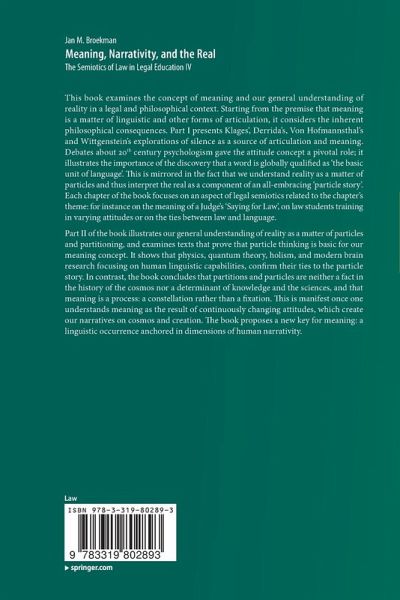This book examines the concept of meaning and ourgeneral understanding of reality in a legal and philosophical context. Startingfrom the premise that meaning is a matter of linguistic and other forms ofarticulation, it considers the inherent philosophical consequences. PartI presents Klages', Derrida's, Von Hofmannsthal's and Wittgenstein'sexplorations of silence as a source of articulation and meaning. Debatesabout 20th century psychologism gave theattitude concept a pivotal role; it illustrates the importance of the discoverythat a word is globally qualified as 'the basic unit of language'. Thisis mirrored in the fact that we understand reality as a matter of particles andthus interpret the real as a component of an all-embracing 'particle story'. Each chapter of the book focuses on an aspect of legal semiotics relatedto the chapter's theme: for instance on the meaning of a Judge's 'Saying forLaw', on law students training in varying attitudes or on the ties between lawand language.