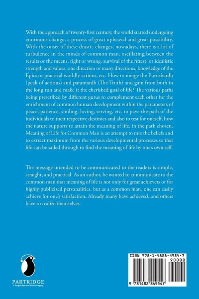With the approach of twenty-first century, the world started undergoing enormous change, a process of great upheaval and great possibility. With the onset of these drastic changes, nowadays, there is a lot of turbulence in the minds of common man, oscillating between the results or the means, right or wrong, survival of the fittest, or idealistic strength and values, one direction or many directions, knowledge of the Epics or practical worldly actions, etc. How to merge the Purushardh (peak of actions) and paramardh (The Truth) and gain from both in the long run and make it the cherished goal of life? The various paths being prescribed by different gurus to complement each other for the enrichment of common human development within the parameters of peace, patience, smiling, loving, serving, etc. to pave the path of the individuals to their respective destinies and also to test for oneself, how the nature supports to attain the meaning of life, in the path chosen. Meaning of Life for Common Man is an attempt to mix the beliefs and to extract maximum from the various developmental processes so that life can be sailed through to find the meaning of life by one's own self.