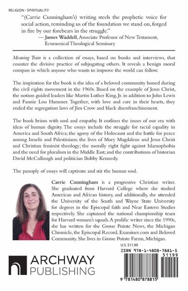 Meaning Train is a collection of essays, based on books and interviews, that counter the divisive practice of subjugating others. It reveals a benign moral compass in which anyone who wants to improve the world can follow. The inspiration for the book is the idea of a beloved community honed during the civil rights movement in the 1960s. Based on the example of Jesus Christ, the notion guided leaders like Martin Luther King, Jr. in addition to John Lewis and Fannie Lou Hammer. Together, with love and care in their hearts, they ended the segregation laws of Jim Crow and black disenfranchisement. The book brims with soul and empathy. It outlines the issues of our era with ideas of human dignity. The essays include the struggle for racial equality in America and South Africa; the agony of the Holocaust and the battle for peace among Israelis and Palestinians; the lives of Mary Magdalene and Jesus Christ and Christian feminist theology; the morally right fight against Islamophobia and the need for pluralism in the Middle East; and the contributions of historian David McCullough and politician Bobby Kennedy. The panoply of essays will captivate and stir the human soul. "(Carrie Cunningham's) writing steels the prophetic voice for social action, reminding us of the foundation we stand on, forged in fire by our forebears in the struggle." - James Waddell, Associate Professor of New Testament, Ecumenical Theological Seminary