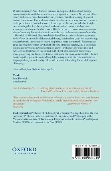 In this new book, the author of the classic Truth presents an original theory of meaning, demonstrates its richness, and defends it against all contenders. He surveys the diversity of twentieth-century philosophical insights into meaning and shows that his theory can reconcile these with a common-sense view of meaning as derived from use. Meaning and its companion volume Truth (now published in a revised edition) together demystify two central issues in philosophy and offer a controversial but compelling view of the relations between language, thought, and reality.