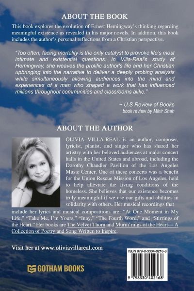 This book explores the evolution of Ernest Hemingway's thinking regarding meaningful existence as revealed in his major novels. In addition, this book includes the author's personal reflections from a Christian perspective. "Too often, facing mortality is the only catalyst to provoke life's most intimate and existential questions. In Villa-Real's study of Hemingway, she weaves the prolific author's life and her Christian upbringing into the narrative to deliver a deeply probing analysis while simultaneously allowing audiences into the mind and experiences of a man who shaped a work that has influenced millions throughout communities and classrooms alike." U.S Review of Books book review by Mihir Shah