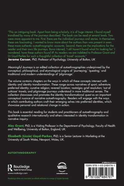 "This an intriguing book. Apart from being scholarly, it is of huge interest. I found myself transfixed by many of the journeys described. The book can be read at several levels. Two were more apparent to me. First, there are the individual journeys and stories. In themselves these are fascinating. I wanted to know more about the authors than was present in even these more authentic autoethnographic accounts. Second, there are the implications for the reader and their own life journeys. Bono intoned, 'I still haven't found what I'm looking for.' I wondered, have these authors found it? As readers we are indebted to Professor Grant and Dr Lloyd-Parkes for such a thoughtful collection of 'travel' accounts." -- Jerome Carson, PhD, Professor of Psychology, University of Bolton, UK
