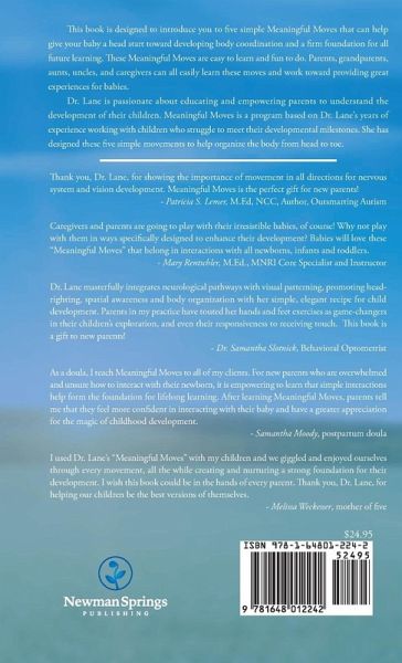 This book is designed to introduce you to five simple Meaningful Moves that can help give your baby a head start toward developing body coordination and a firm foundation for all future learning. These Meaningful Moves are easy to learn and fun to do. Parents, grandparents, aunts, uncles, and caregivers can all easily learn these moves and work toward providing great experiences for babies. Dr. Lane is passionate about educating and empowering parents to understand the development of their children. Meaningful Moves is a program based on Dr. Lane's years of experience working with children who struggle to meet their developmental milestones. She has designed these five simple movements to help organize the body from head to toe.