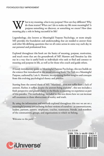What is my meaning, what is my purpose? How are they different? Why do these matter? What can I do to make my life more meaningful? Is purpose something we discover, or something we create? How does meaning play a role in being successful in life? Logoteleology, also known as Meaningful Purpose Psychology, or more simply MP, provides the foundation and understanding that are needed to answer these and other life-defining questions that we all come across in some way each day in our personal and professional lives. Explored throughout this book are the basics of meaning, purpose, motivation, and much more that are the groundwork of MP. Marrero and Persuitte lay this out in a way that is useful both to individuals who seek to find and connect to meaning and purpose in life, as well as for those who coach and guide others. A handy introductory guide to Meaningful Purpose Psychology, this text builds on the science first introduced in the award-winning book The Path to a Meaningful Purpose, authored by Luis A. Marrero, incorporating further insights and concepts from this evolving psychological theory and practice. Starting from the central thesis of MP, "Mankind...does not suffer from a lack of answers. Rather, it suffers despite the answers being available", this text includes a fresh perspective and greater clarity to the blocks to meaning we experience as part of this paradox. The methodology included in this text shows how we can increase self-awareness to these obstructions of reality and truth. By using the information and methods explored throughout this text we are on a meaningful journey toward being the best versions of ourselves - as communicators, leaders, partners, parents, employees, coaches, teammates, friends, and members of the communities, groups, and organizations to which we belong. Welcome to the path!