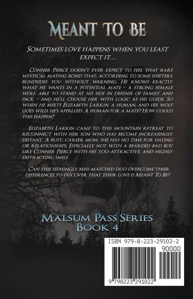 Sometimes love happens when you least expect it… Conner Pierce doesn't ever expect to feel that rare mystical mating bond that, according to some shifters, blindsides you without warning. He knows exactly what he wants in a potential mate - a strong female wolf, able to stand at his side in defense of family and pack - and he'll choose her with logic as his guide. So when he meets Elizabeth Larkin, a human, and his wolf goes wild, he's appalled. A human for a mate? How could this happen? Elizabeth Larkin came to this mountain retreat to reconnect with her son who has become increasingly distant. A busy, career mom, she has no time for dating or relationships. Especially not with a bearded bad boy like Conner Pierce with his too-attractive, and highly distracting smile. Can this seemingly miss-matched duo overcome their differences to discover that their love is Meant To Be?