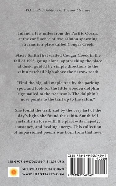 Inland a few miles from the Pacific Ocean, at the confluence of two salmon spawning streams is a place called Cougar Creek. Stacie Smith first visited Cougar Creek in the fall of 1998, going alone, approaching the place at dusk, guided by simple directions to the cabin perched high above the narrow road: "Find the big, old maple tree by the parking spot, and look for the little wooden dolphin sign nailed to the tree trunk. The dolphin's nose points to the trail up to the cabin." She found the trail, and by the very last of the day's light, she found the cabin. Smith fell instantly in love with the place-its majesty, constancy, and healing energy. This collection of impassioned poems was born from that love.