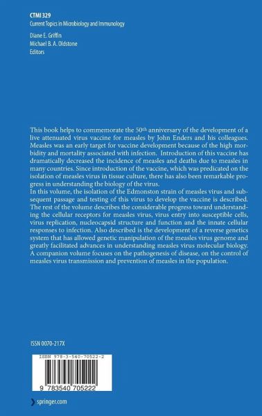 Measles virus, one of the most contagious of all human viruses, has been largely contained by the development and use of a vaccine that was introduced 50 years ago. These two volumes were timed to honor the introduction of the vaccine and to record the enormous advancements made in understanding the molecular and cell biology, pathogenesis, and control of this infectious disease. Where vaccine has been effectively delivered, endemic measles virus transmission has been eliminated. However, difficulties in vaccine delivery, lack of health care support and objection to vaccination in some communities continue to result in nearly 40 million cases and over 300,000 deaths per year from measles.