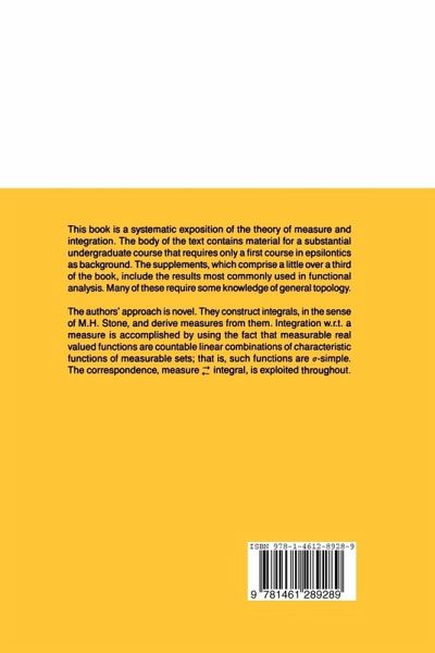 This is a systematic exposition of the basic part of the theory of mea sure and integration. The book is intended to be a usable text for students with no previous knowledge of measure theory or Lebesgue integration, but it is also intended to include the results most com monly used in functional analysis. Our two intentions are some what conflicting, and we have attempted a resolution as follows. The main body of the text requires only a first course in analysis as background. It is a study of abstract measures and integrals, and comprises a reasonably complete account of Borel measures and in tegration for R Each chapter is generally followed by one or more supplements. These, comprising over a third of the book, require some what more mathematical background and maturity than the body of the text (in particular, some knowledge of general topology is assumed) and the presentation is a little more brisk and informal. The material presented includes the theory of Borel measures and integration for ~n, the general theory of integration for locally compact Hausdorff spaces, and the first dozen results about invariant measures for groups. Most of the results expounded here are conventional in general character, if not in detail, but the methods are less so. The following brief overview may clarify this assertion.