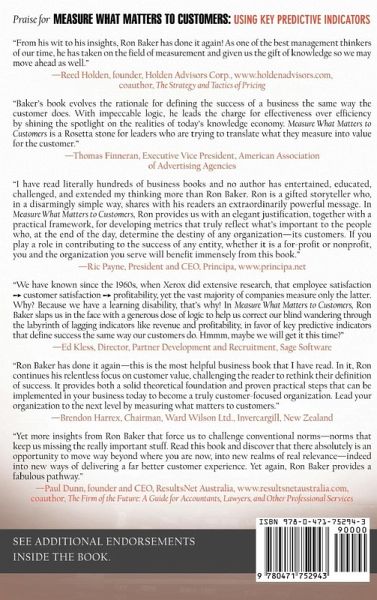 "I have read literally hundreds of business books and no author has entertained, educated, challenged, and extended my thinking more than Ron Baker. Ron is a gifted storyteller who, in a disarmingly simple way, shares with his readers an extraordinarily powerful message. In Measure What Matters to Customers, Ron provides us with an elegant justification, together with a practical framework, for developing metrics that truly reflect what's important to the people who, at the end of the day, determine the destiny of any organization-its customers. If you play a role in contributing to the success of any entity, whether it is a for-profit or nonprofit, you and the organization you serve will benefit immensely from this book."