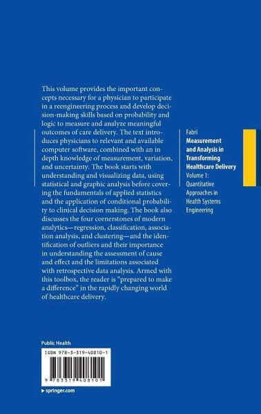 This volume provides the important concepts necessary for a physician to participate in a reengineering process, develop decision-making skills based on probability and logic rather than "rules," and to measure and analyze meaningful outcomes of care delivery. This approach has been developed over ten years in a medical student-based program and has been enthusiastically embraced by medical students without backgrounds in engineering or statistics. More specifically, this text will introduce physicians to relevant and available computer software, combined with an in depth knowledge of measurement, variation, and uncertainty. It provides a basis for the transformation of data into information, information into knowledge, and knowledge into wisdom. The first quarter of the book will address understanding and visualizing data, using statistical and graphic analysis. The next quarter addresses the fundamentals of applied statistics, and the application ofconditional probability to clinical decision making. The next quarter addresses the four "cornerstones" of modern analytics: regression, classification, association analysis, and clustering. The final section addresses the identification of outliers and their importance in understanding, the assessment of cause and effect and the limitations associated with retrospective data analysis. This toolbox will prepare the interested physician to actively engage in the identification of problem areas, the design of process-based solutions, and the continuous assessment of outcomes of clinical practice. Armed with this toolbox, the reader will be "prepared to make a difference" in the rapidly changing world of healthcare delivery.