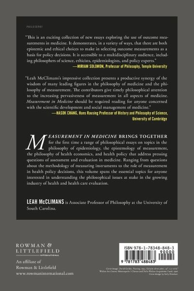 Introduction / Part I: Measurement and Evidence-Based Medicine / 1. How Evidence-Based Medicine Highlights Connections between Measurement and Evidence Benjamin Smart / 2. Can Causation be Quantatively Measured? Alex Broadbent / 3. Absolute Measures of Effectiveness Jacob Stegenga and Aaron Kenna / 4. A Causal Construal of Heritability Estimates Zinhle Mncube / Part II: Measuring Instruments / 5. A Theory of Measurement Norman M. Bradburn Nancy L. Cartwright and Jonathan Fuller / 6. Psychological Measures Risk and Values Leah M. McClimans / 7. The Epistemological Roles of Models in Health Science Measurement Laura M. Cupples / 8. Measuring the Pure Patient Experience Eivind Engebretsen and Kristin Heggen / 9. Measurement Multiple Concurrent Chronic Conditions and Complexity Ross E. G. Upshur / Part III: Measurement and Policy / 10. NICE's Cost-Effectiveness Threshold Gabriele Badano Stephen John and Trenholme Junghans / 11. Cost Effectiveness Daniel M. Hausman / 12. The Value of Statistical