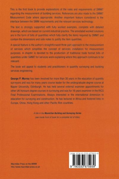 This is the first book to provide explanations of the rules and requirements of SMM7 regarding the measurement of building services. References are also made to the SMM7 Measurement Code where appropriate. Another important feature considered is the interface between the SMM requirements and the relevant services technology. The text is strongly supported with fully worked examples, complete with detailed drawings, which are based on current industrial practice.