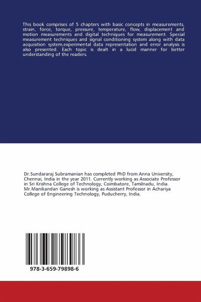 This book comprises of 5 chapters with basic concepts in measurements, strain, force, torque, pressure, temperature, flow, displacement and motion measurements and digital techniques for measurement. Special measurement techniques and signal conditioning system along with data acquisition system,experimental data representation and error analysis is also presented. Each topic is dealt in a lucid manner for better understanding of the readers.