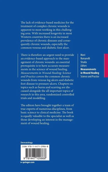 SECTION 1.- Vascular diseases and wound healing.- Leg ulcers/role of venous surgery/ stenting/amputation/microcirculation.- Diabetic foot disease and wound healing.- Neuropathic and neuroischaemic foot disease/management/limitations of SW monofilament/bone mineral disease measurements/.- Skin and wound healing.- Lower extremity wounds/pressure ulcers/epidermolysis bullosa/vasculitis.- Nutrition and wound healing.- In pressure ulcers/managing elderly/relevance of measurements.- Musculo Skeletal injuries and wound healing.- Trauma/common defects/measurements and their management.- Nervous system injuries and wound healing.- Lesions in those with spinal defects.- Complications in wound healing.- Infection/biofilms/managing comorbidities and relevant workup.- Epidemiology of wounds.- Lower extremity/diabetic foot/pressure wounds/area measurements and prognosis.- SECTION 2.- Measuring Pressure.- Monofilaments/for gait analysis/for pressure relief.- Non invasive diagnostic measurements.- Vascular, tissue oxygen/areas and volumes.- Imaging measurements in wound healing.- Ultrasound, florescence microscopy/CT/MR.- The promise of measuring hypoxia.- Redox potentials/hypoxia and measurements.- SECTION 3.- Managing burns.- Burn wound management including measurements.- Managing scars.- Measurements to improve scar management.- Developments in scar management.- SECTION 4.- Designing research studies in wound healing.- RCTs/Mechanistic studies.- Modelling in wound healing.- The use of systems biology.- Appendices.- List of Equipment Manufactures.