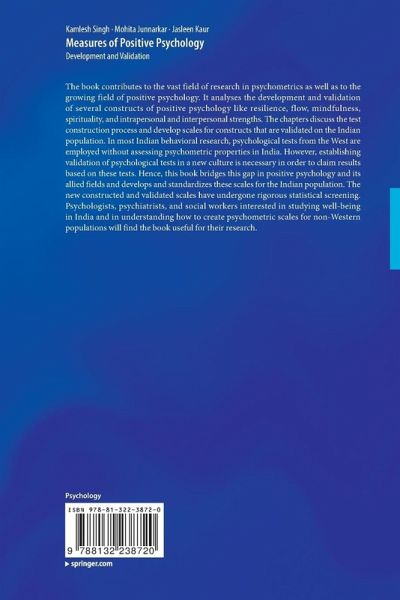 The book contributes to the vast field of research in psychometrics as well as to the growing field of positive psychology. It analyses the development and validation of several constructs of positive psychology like resilience, flow, mindfulness, spirituality, and intrapersonal and interpersonal strengths. The chapters discuss the test construction process and develop scales for constructs that are validated on the Indian population. In most Indian behavioral research, psychological tests from the West are employed without assessing psychometric properties in India. However, establishing validation of psychological tests in a new culture is necessary in order to claim results based on these tests. Hence, this book bridges this gap in positive psychology and its allied fields and develops and standardizes these scales for the Indian population. The new constructed and validated scales have undergone rigorous statistical screening. Psychologists, psychiatrists, and social workers interested in studying well-being in India and in understanding how to create psychometric scales for non-Western populations will find the book useful for their research.