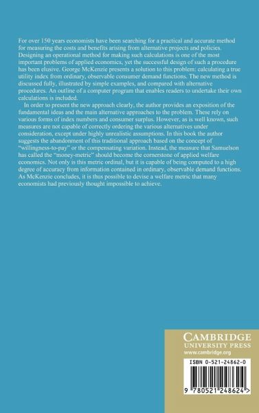 Preface; 1. An introduction to the money-metric; 2. The marginal utility of money as an integrating factor; 3. Calculation of the money-metric; 4. The approach of Dupuit and Marshall; 5. The Hicksian approach; 6. Approximations based on consumer surplus; 7. A reconsideration of the theory of index numbers; 8. The money-metric as a basis for calculation of social welfare functions; 9. Measurement of the social costs of monopoly; 10. A final comment and conclusion; References; Index.