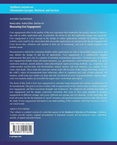 User engagement refers to the quality of the user experience that emphasizes the positive aspects of interacting with an online application and, in particular, the desire to use that application longer and repeatedly. User engagement is a key concept in the design of online applications (whether for desktop, tablet or mobile), motivated by the observation that successful applications are not just used, but are engaged with. Users invest time, attention, and emotion in their use of technology, and seek to satisfy pragmatic and hedonic needs. Measurement is critical for evaluating whether online applications are able to successfully engage users, and may inform the design of and use of applications. User engagement is a multifaceted, complex phenomenon; this gives rise to a number of potential measurement approaches. Common ways to evaluate user engagement include using self-report measures, e.g., questionnaires; observational methods, e.g. facial expression analysis, speech analysis; neuro-physiological signal processing methods, e.g., respiratory and cardiovascular accelerations and decelerations, muscle spasms; and web analytics, e.g., number of site visits, click depth. These methods represent various trade-offs in terms of the setting (laboratory versus ``in the wild''), object of measurement (user behaviour, affect or cognition) and scale of data collected. For instance, small-scale user studies are deep and rich, but limited in terms of generalizability, whereas large-scale web analytic studies are powerful but negate users' motivation and context. The focus of this book is how user engagement is currently being measured and various considerations for its measurement. Our goal is to leave readers with an appreciation of the various ways in which to measure user engagement, and their associated strengths and weaknesses. We emphasize the multifaceted nature of user engagement and the unique contextual constraints that come to bear upon attempts to measure engagement in different settings, and across different user groups and web domains. At the same time, this book advocates for the development of ``good'' measures and good measurement practices that will advance the study of user engagement and improve our understanding of this construct, which has become so vital in our wired world.