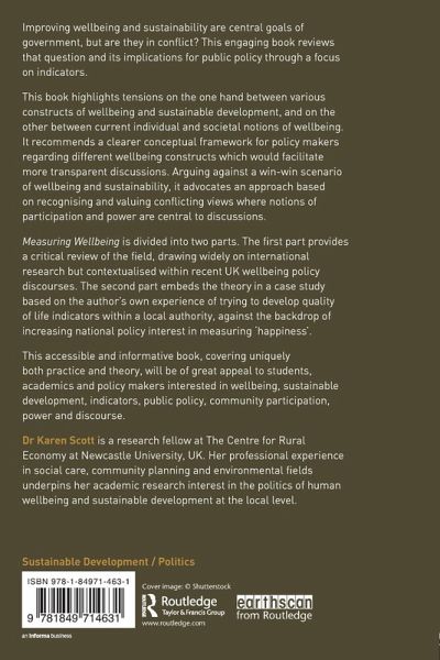Improving wellbeing and sustainability are central goals of government, but are they in conflict? This engaging new book reviews that question and its implications for public policy through a focus on indicators. It highlights tensions on the one hand between various constructs of wellbeing and sustainable development, and on the other between current individual and societal notions of wellbeing. It recommends a clearer conceptual framework for policy makers regarding different wellbeing constructs which would facilitate more transparent discussions. Arguing against a win-win scenario of wellbeing and sustainability, it advocates an approach based on recognising and valuing conflicting views where notions of participation and power are central to discussions. Measuring Wellbeing is divided into two parts. The first part provides a critical review of the field, drawing widely on international research but contextualised within recent UK wellbeing policy discourses. The second part embeds the theory in a case study based on the author's own experience of trying to develop quality of life indicators within a local authority, against the backdrop of increasing national policy interest in measuring 'happiness'. This accessible and informative book, covering uniquely both practice and theory, will be of great appeal to students, academics and policy makers interested in wellbeing, sustainable development, indicators, public policy, community participation, power and discourse.