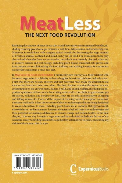 In Meat Less: The Next Food Revolution I outline my own journey as a food scientist who became a vegetarian in solidarity with my daughter. In writing this book I take the viewpoint that there are no easy answers and that everyone must make the decision to eat meat or not based on their own values. The first chapters examine the impact ofmeat consumption on the environment, human health, and animal welfare, including the important questions of how much does eating meat really contribute to greenhouse gas emissions, pollution, and biodiversity loss, what are the ethical implications of raising and killing animals for food, and the impact of reducing meat consumption on human nutrition and health. I then discuss some of the new technologies that are being developed to create alternatives to meat, including plant-based meat, cultured (lab-grown) meat, microbial meat, and insect meat. I present the science behind these new technologies and their potential for making a difference to climate change and human health. In the final chapter, I discuss why I remain a vegetarian and have decided to dedicate the rest of my scientific career to finding sustainable and healthy alternatives to meat, presenting my vision of the human diet in 2050.