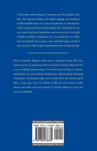 Born in Germany, Margitta Acker came to Australia in June 1962. Five weeks later, she was married at St Peter's Lutheran Church in Reid. For her, it was a wedding among strangers. Her memories of settling in Canberra, exploring her new surroundings, finding work, making friends and raising a family give a fascinating insight into everyday life in the national capital half a century ago, when Lake Burley Griffin was non-existent, mobile phones and credit cards were unheard of, and the suburb of Curtin was out in the paddocks.