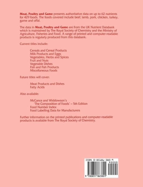 Meat, Poultry and Game forms a major update to The Composition of Foods 5th Edition, providing new and extensive nutritional composition data for 429 foods in this significant food group. It provides new information on both raw and cooked meats, including lamb, pork, beef, veal, chicken, turkey, duck, grouse, goose, pheasant, pigeon, hare, rabbit, venison, heart, kidney, liver, oxtail, sweetbread and tongue. Easy-to-read tables provide composition data (per 100g of food) for up to 62 nutrients. The main tables list data for 42 nutrients, and supplementary tables include individual fatty acids (expressed per 100g of total fatty acids), retinol fractions, and vitamin D fractions for selected foods. There are also details on cooking methods, weight losses on cooking meats, a listing of taxonomic and alternative food names, and a food index. Meat, Poultry and Game forms an essential, authoritative and up-to-date source of new nutrient data. It is an essential reference source for professionals and students of food science and nutrition and will also be of interest to the layperson with interests in diet and nutrition.