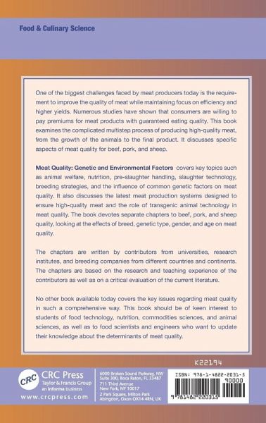 One of the biggest challenges faced by meat producers today is the requirement to improve the quality of meat while maintaining focus on efficiency and higher yields. Numerous studies have shown that consumers are willing to pay premiums for meat products with guaranteed eating quality. This book examines the complicated multistep process of producing high-quality meat, from the growth of the animals to the final product. It discusses specific aspects of meat quality for beef, pork, and sheep. Meat Quality: Genetic and Environmental Factors covers key topics such as animal welfare, nutrition, pre-slaughter handling, slaughter technology, breeding strategies, and the influence of common genetic factors on meat quality. It also discusses the latest meat production systems designed to ensure high-quality meat and the role of transgenic animal technology in meat quality. The book devotes separate chapters to beef, pork, and sheep quality, looking at the effects of breed, genetic type, gender, and age on meat quality. The chapters are written by contributors from universities, research institutes, and breeding companies from different countries and continents. The chapters are based on the research and teaching experience of the contributors as well as on a critical evaluation of the current literature. No other book available today covers the key issues regarding meat quality in such a comprehensive way. This book should be of keen interest to students of food technology, nutrition, commodities sciences, and animal sciences, as well as to food scientists and engineers who want to update their knowledge about the determinants of meat quality.