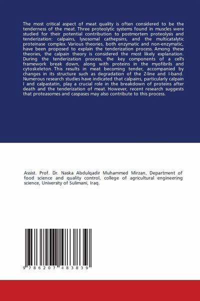 The most critical aspect of meat quality is often considered to be the tenderness of the meat. Three proteolytic systems found in muscles were studied for their potential contribution to postmortem proteolysis and tenderization: calpains, lysosomal cathepsins, and the multicatalytic proteinase complex. Various theories, both enzymatic and non-enzymatic, have been proposed to explain the tenderization process. Among these theories, the calpain theory is considered the most likely explanation. During the tenderization process, the key components of a cell's framework break down, along with proteins in the myofibrils and cytoskeleton. This results in meat becoming tender, accompanied by changes in its structure such as degradation of the Z-line and I-band. Numerous research studies have indicated that calpains, particularly calpain I and calpastatin, play a crucial role in the breakdown of proteins after death and the tenderization of meat. However, recent research suggests that proteasomes and caspases may also contribute to this process.
