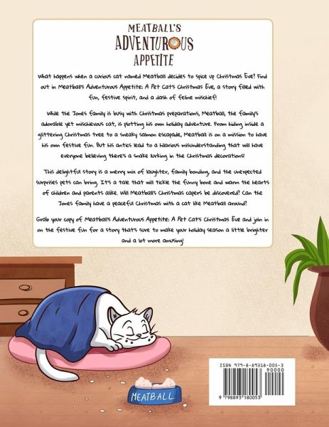 Dive into the heartwarming and hilarious world of Meatball's Adventurous Appetite: A Pet Cat's Christmas Eve, a charming tale perfect for young readers this holiday season! Meet Meatball, the lovably messy and plump white cat of the Jones family, who's got a big appetite for food and adventure, especially during Christmas. It's the day before Christmas, and the Jones family is all set for a festive celebration. But little do they know, Meatball has his own plans. From eyeing the family's newly decorated Christmas tree with its fascinating bird and rabbit ornaments to secretly plotting a salmon heist in the kitchen, Meatball is up to his whiskers in mischief! As Meatball's adventures lead to a hilarious mix-up, involving a supposed 'snake' in the Christmas tree, the whole family is in for a Christmas Eve filled with laughter, surprises, and a little bit of chaos. Meatball's Adventurous Appetite: A Pet Cat's Christmas Eveis a delightful read that captures the essence of family fun, holiday spirit, and the amusing antics of a pet that has a knack for getting into trouble. Perfect for young children who love animals and Christmas, this book is sure to become a favorite for bedtime stories and family reading time. Join Meatball and the Jones family for an unforgettable Christmas Eve adventure! Get your copy today!